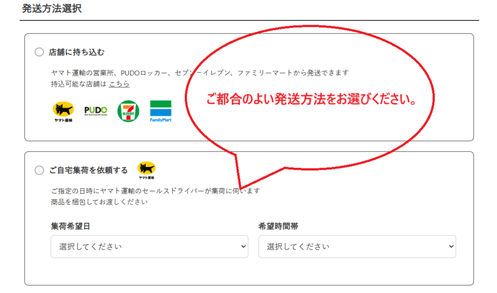 上図をご参照のうえ、ご都合のよい発送方法をお選びください。画面下部の「確定」ボタンを押していただくと、発送用のQRコードをメールにてお送りいたします。確定後、入力内容の変更ができませんので、ご注意ください。