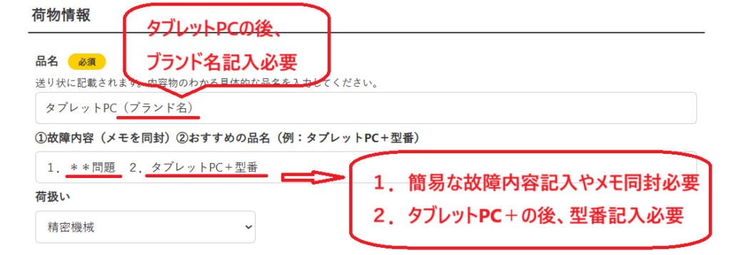 ②上図をご参照のうえ、故障内容の欄には、簡単な故障内容をご記入ください。もしくは、故障内容を記載したメモを同封していただいても構いません。また、タブレットPC+の後に必ず型番をご記入ください。